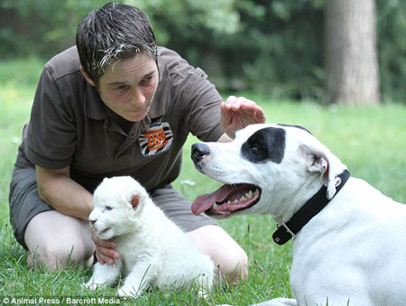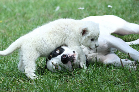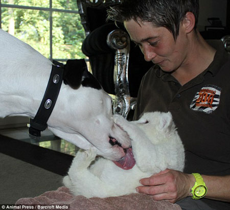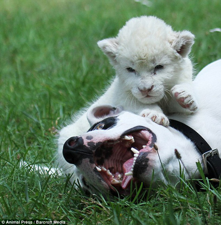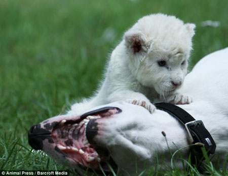 Sư tử trắng quý hiếm... nhận chó làm cha