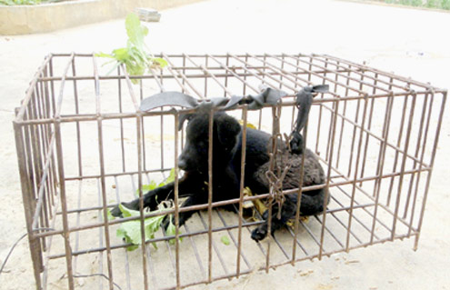 Một con chó lạ bị bắt sống, chuẩn bị đưa đi tiêu hủy. Ảnh: Báo Lào Cai.