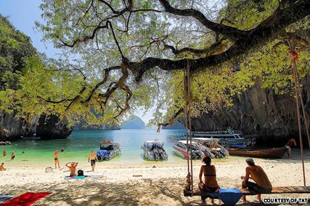 Còn đảo Phi Phi được mệnh danh là hòn đảo đẹp nhất du lịch châu Á với bãi biển dài ngút ngàn cùng những hàng dừa rợp bóng, sai trĩu quả. Vào các buổi chiều, ánh hoàng hôn lấp lánh trên biển mang đến cho du khách những cảm giác thư giãn khi vừa ngâm mình giữa làn nước trong xanh, vừa thưởng thức dừa tươi và các món hải sản độc đáo.