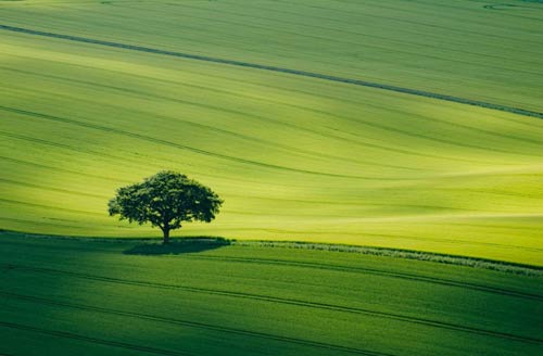 | Một cái cây đứng sừng sững giữa cánh đồng màu xanh lá mạ mênh mông ở Công viên Quốc gia South Downs, Hampshire. |