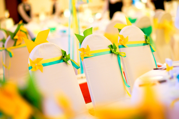 | Chuyên gia tổ chức tiệc cưới sử dụng hai sắc màu vàng và xanh xen kẽ tạo sự tươi tắn cho tiệc. |