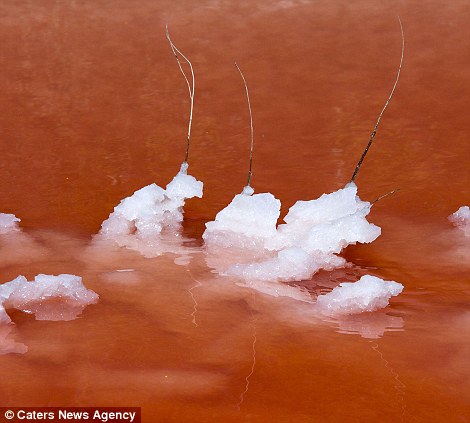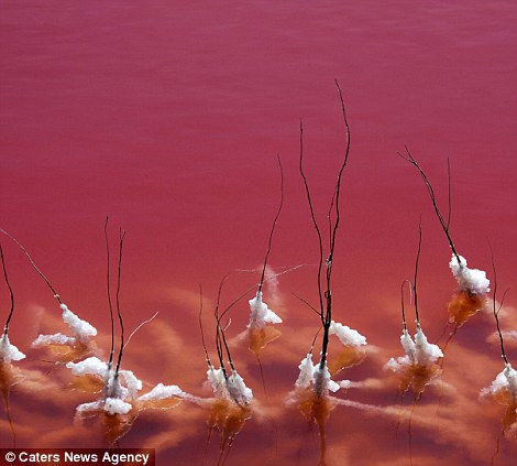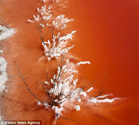 Các tinh thể muối trắng bám vào cành cây khô trên nền nước hồ màu đỏ tạo nên khung cảnh như trong một bộ phim khoa học học viễn tưởng về người ngoài hành tinh.