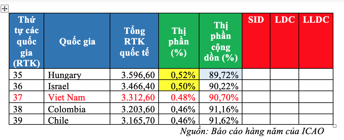 Việt Nam đứng thứ 37, chiếm 0,48%. Theo số liệu thống kê của ICAO, về thị phần RTK của