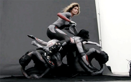 Thoạt nhìn từ xa người ta sẽ lầm tưởng các cô gái vẽ màu trên người (body painting) đang ngồi trên một chiếc motor phân khối lớn.