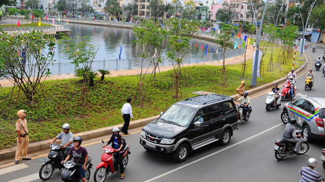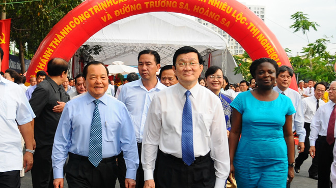 | Chủ tịch nước Trương Tấn Sang (giữa), Bí thư Thành ủy TP.HCM Lê Thanh Hải (bìa trái), Giám đốc quốc gia WB tại VN Victoria Kwakwa (bìa phải) cùng các đại biểu đi bộ trên đường Trường Sa - Ảnh: T.T.D. |