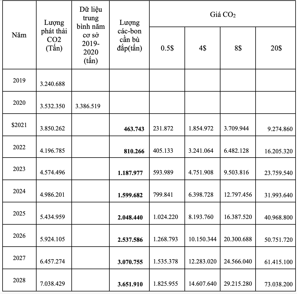 -Với mức giá 4$ cho một tấn CO2, chi phí bù đắp tối đa năm 2021 là 1.854.972$, năm 2026 là 1.268.793$, năm 2030 là 19.903.356$.