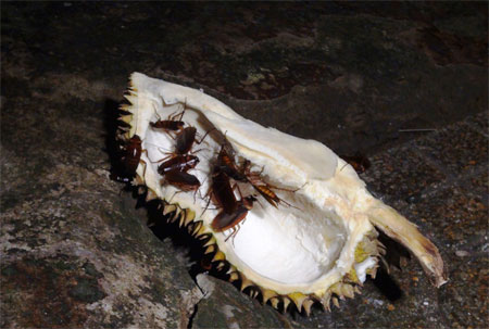 Sau đó bà Anh đến các miệng cống để thu chiến lợi phẩm. Trên miếng vỏ sầu riêng và miếng vải quết mạch nha, hàng chục chú gián vẫn đang “say mồi”, bất chấp anh đèn pin rọi trực diện vào. Bà Anh cầm từng thứ cho vào xô rũ nhẹ, lũ gián rơi gọn vào xô đã được quét một lớp mỡ trơn, khiến chúng khó bò ra. Cứ lặp lại như vậy vài lần, bà Anh thu được hàng trăm con gián.
