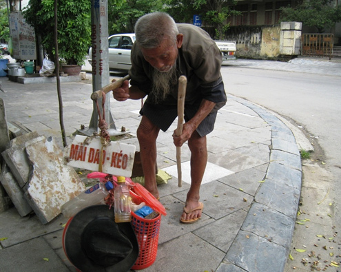 4h sáng, cụ Vũ Văn Chanh ở làng Xa Vệ, xã Hoằng Trung (Hoằng Hóa, Thanh Hóa) thức dậy gói hành lý bắt đầu một ngày mưu sinh. Trời vào đông nhưng cụ chỉ phong phanh manh áo mỏng bạc phếch và cứ thế gánh đồ nghề đi khắp thành phố Thanh Hóa, vừa đi vừa rao "ai mài dao kéo đi". Gặp khách, cụ chậm rãi giở hòn đá mài, cái chậu đựng nước và còng lưng rạp đất miệt mài mài dao.