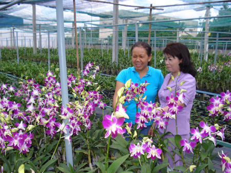 | Bà Hà (phải) thăm vườn lan của chị Dương Thị Minh Hồng. |
