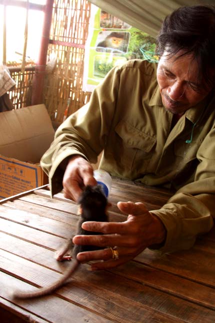 Anh mua sữa tươi, đun ấm, đổ vào bình sữa, rồi cho nó bú như trẻ nhỏ. Nhưng khỉ mới sinh, cái miệng bé xíu bằng đầu đũa, không thể há được để ngậm vú giả. Anh phải vạch miệng nó, rồi kiên trì nhỏ từng giọt.