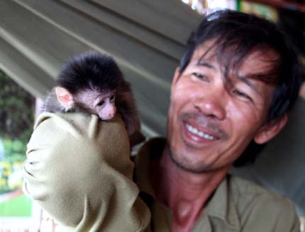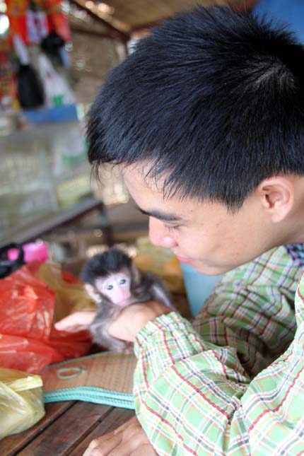 | Chú khỉ con ngày mới được anh Truyền đem về nuôi. |