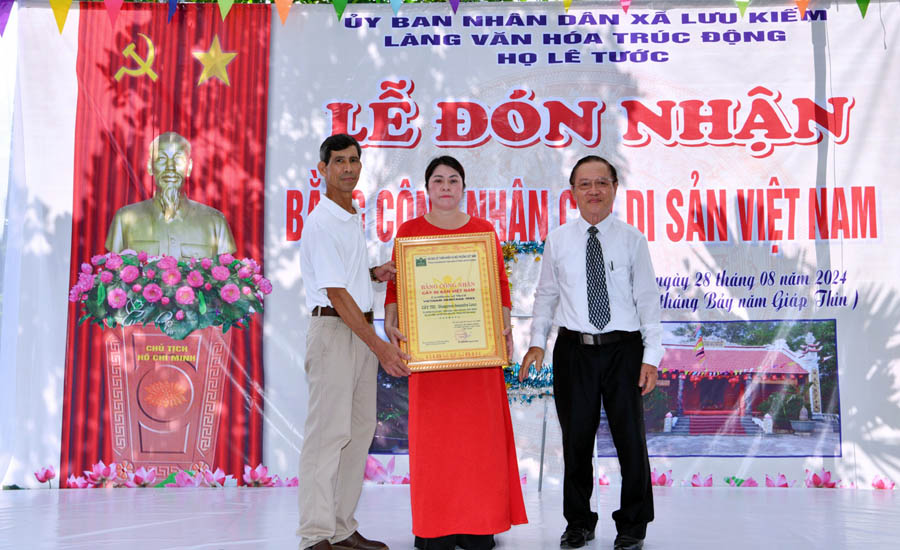 Đại diện lãnh đạo xã Lưu Kiếm và dòng họ Lê Tước nhận Bằng công nhận Cây Di sản Việt Nam
