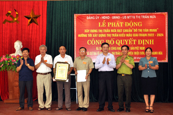 Nhà báo Phùng Quang Chính, Phó Chủ tịch Hội đồng Cây Di sản Việt Nam trao Bằng công nhận 22 cây Xà cừ là Cây Di sản cho lãnh đạo thị trấn Nưa