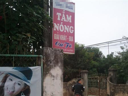 Vừa tới Thuần Mỹ, những biển hiệu "tắm nóng lạnh, cafe" xuất hiện dày đặc hai bên đường. Bên ngoài cổng những biển hiệu này, một vài cô gái đang trò chuyện. Thấy có người lạ, những cô gái này đứng dậy chèo kéo khách. Không chỉ có đường lớn, các con ngõ nhỏ dù chỉ đủ xe máy đi vừa cũng treo rất nhiều các biển hiệu này.