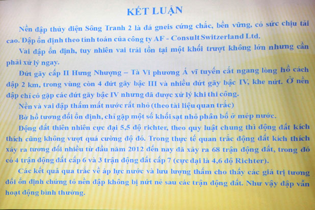 | Kết luận của Đoàn Chủ tịch Hội thảo về độ an toàn của nền Sông Tranh 2 được đánh giá là “một tuyên bố dũng cảm” (ảnh chụp màn hình trình chiếu tài liệu từ hội thảo). |