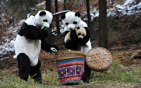 | Sáu tháng kể từ khi chào đời, Tao Tao và mẹ nó, Cao Cao, được đưa lên núi để chúng tập sống trong môi trường hoang dã. Một nhân viên của khu bảo tồn Ngọa Long mặc trang phục giống gấu trúc để bế Tao Tao lên núi. Người ta bôi phân và nước tiểu của gấu trúc lên trang phục để gấu trúc không thể phát hiện hơi người. |
