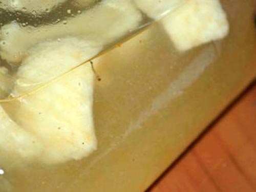 Sinh vật lạ (màu đen, nằm sát miếng snack YOYO trên mặt nước) trong bì nước của bà Dưa ngâm YOYO