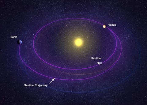 | Hình minh họa vị trí của kính thiên văn Sentinel trên quỹ đạo của sao Kim. Ảnh: B612. |