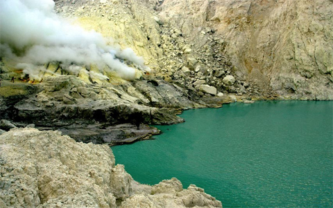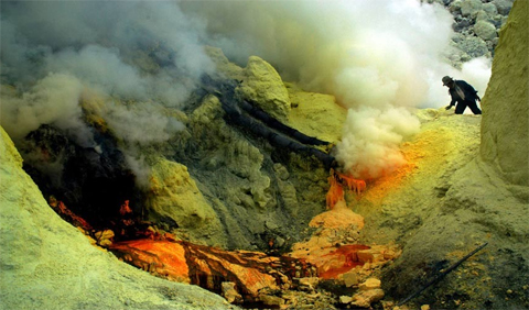 | Một công ty đã thuê người khai thác lưu huỳnh trong miệng núi lửa. |
