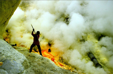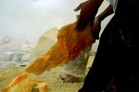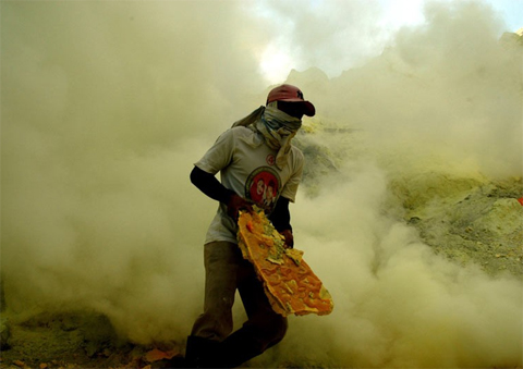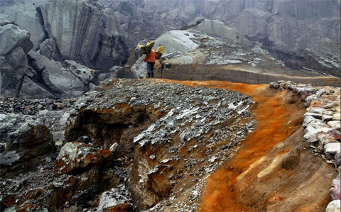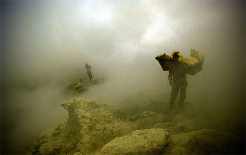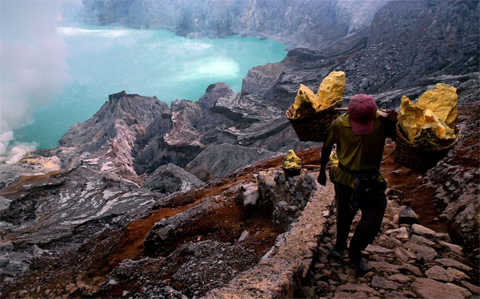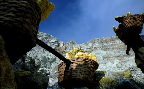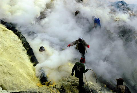 | Phần lớn công nhân gánh lưu huỳnh lên miệng núi lửa hai lần mỗi ngày. |