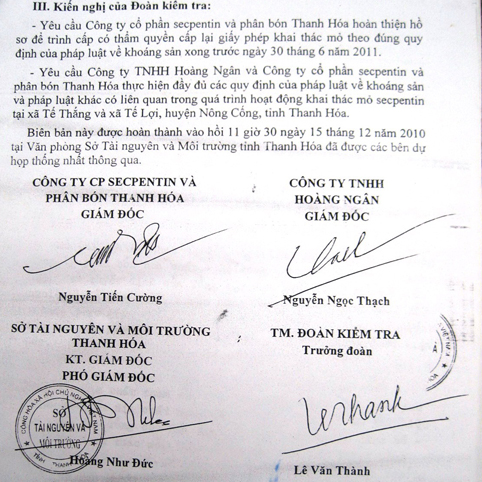 Biên bản của Đoàn kiểm tra của Sở TNMT Tỉnh Thanh Hóa yêu cầu công ty SerpantineThanh Hóa hoàn chỉnh hồ sơ để cấp giấy phép khai thác khoáng sản theo đúng quy định của Luật khoáng sản. Tuy nhiên đến nay Công ty cũng không thèm thực hiện