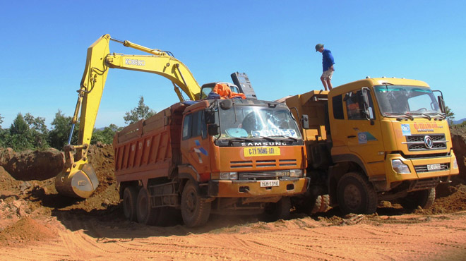 Vừa dừng xe trước mỏ đá Hồng Sơn, chúng tôi thấy ba chiếc xe ben vừa ăn hàng chạy ra. Nhìn lên mỏ đá chỉ thấy đất bụi bay mù mịt, hai chiếc xe chuyên dụng đang múc đất đổ ào ào lên thùng những chiếc xe ben nằm chầu chực. Ông Ân, chủ mỏ đá Hồng Sơn, cho biết mỏ đá của ông có trữ lượng khoảng 1 triệu m3 đất. Hằng ngày có rất nhiều xe vào, ra mua đất san lấp mặt bằng. Ông Ân ra giá: nếu người mua đưa máy đến múc lấy đất thì 5.000 đồng/m3, còn nếu ông cho máy đào xúc đất lên xe thì 10.000 đồng/m3.