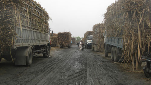 Thời điểm này có trên 700 xe tải chở mía với trọng tải trên 30 tấn, vượt gấp đôi so với tải trọng xe, đang xếp hàng dài, đậu ngổn ngang trên đường Lê Lợi để chờ nhập mía cho nhà máy đường An Khê. Đây cũng là thực tế rất quen thuộc diễn ra trên con đường này từ mấy năm nay.