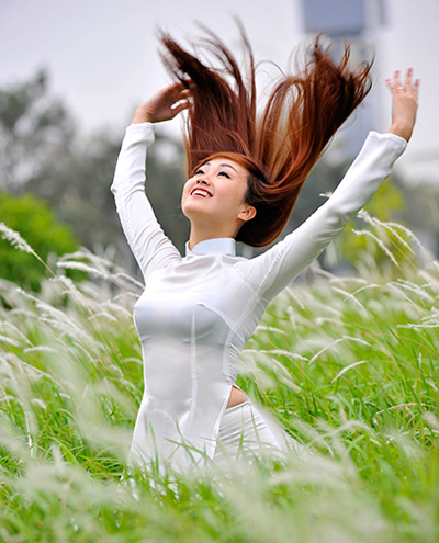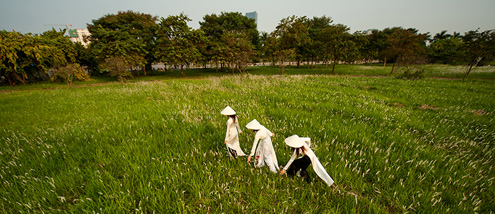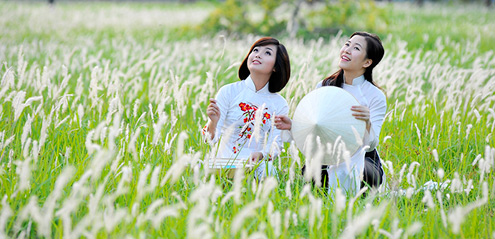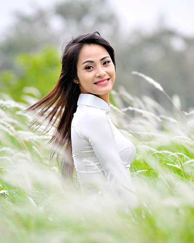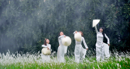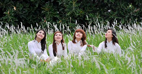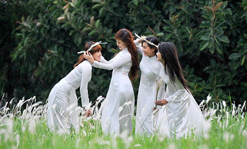 | Áo dài trắng hoà quyện cùng màu tinh khiết của cây cỏ. |
