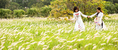 | Dắt tay nhau đi giữa rừng cỏ. |