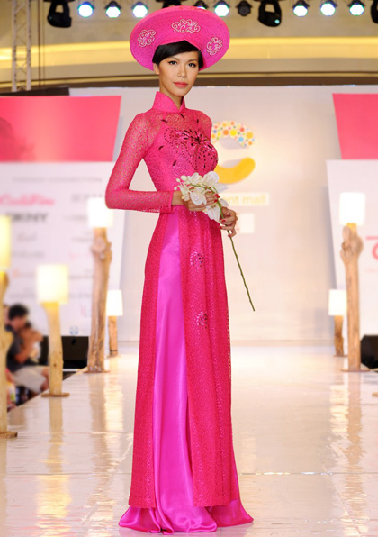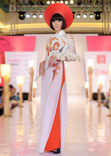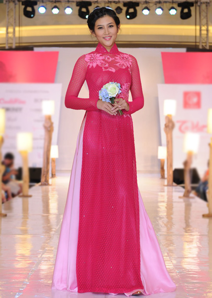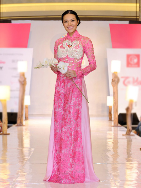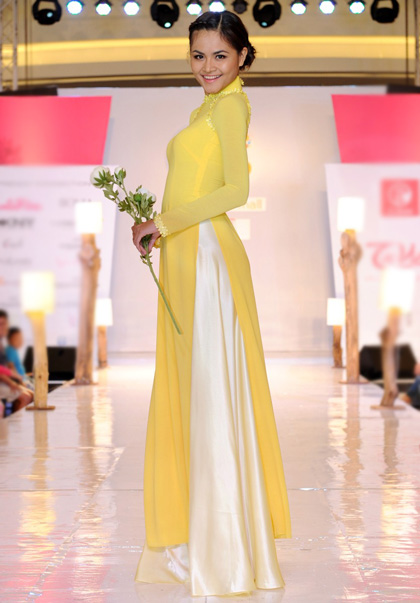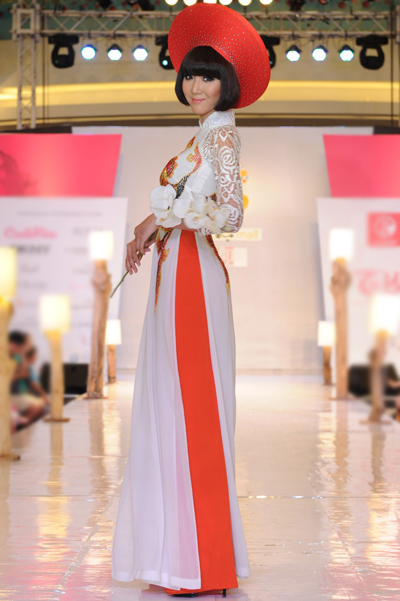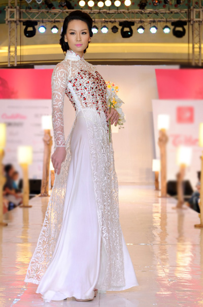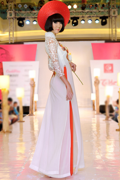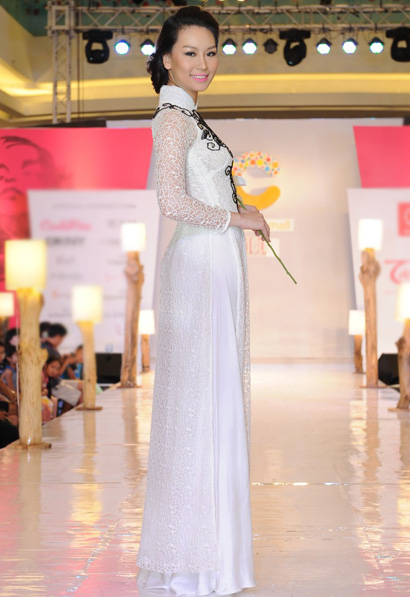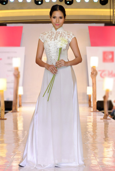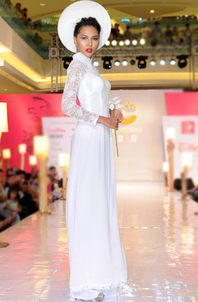 | Cô trình diễn bộ sưu tập áo dài của hai nhà thiết kế Bảo Thạch và Đặng Văn Ngời. |