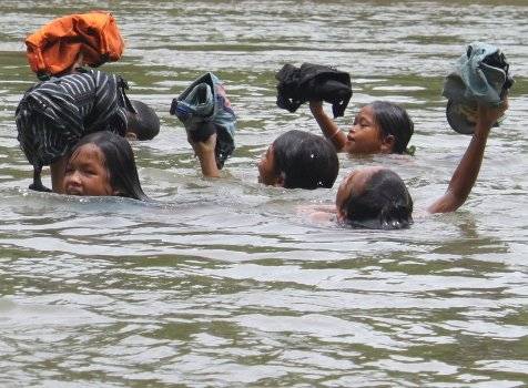 Cứ chờ... như thế , các em học sinh tiếp tục bơi qua sông để đến trường !