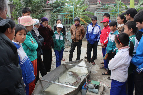 | Nghe tin anh Tý bắt được cá chình khủng, rất nhiều người dân đến xem. |