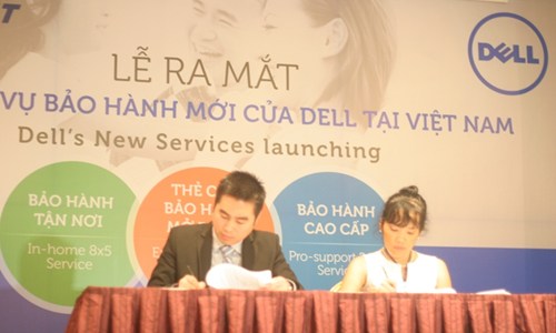 Bà Nguyễn Ngọc Phương Mai - Phó Tổng Giám Đốc Lạc Việt (bên phải) cùng đại diện Dell ký thỏa thuận hợp tác triển khai dịch vụ bảo hành tận nơi cho thị trường Việt Nam sáng 5/10/2012.