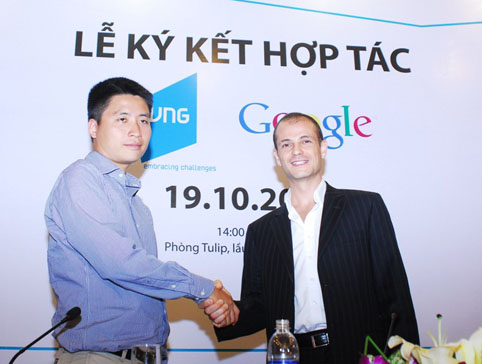 Ông Vương Quang Khải (Phó tổng giám đốc VNG) và ông Sergio Salvador (Trưởng đại diện Google Đông Nam Á) ký kết hợp đồng hợp tác.