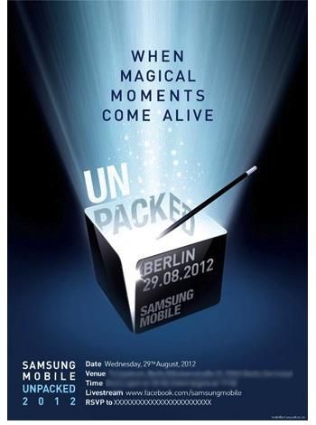 (08:33:05 AM 05/08/2012)Trong sự kiện Mobile Unpacked 2012, diễn ra vào 29.8 tới, Samsung sẽ ra mắt điện thoại thông minh mới là Galaxy Note 2, sau thành công của phiên bản trước là Galaxy Note.