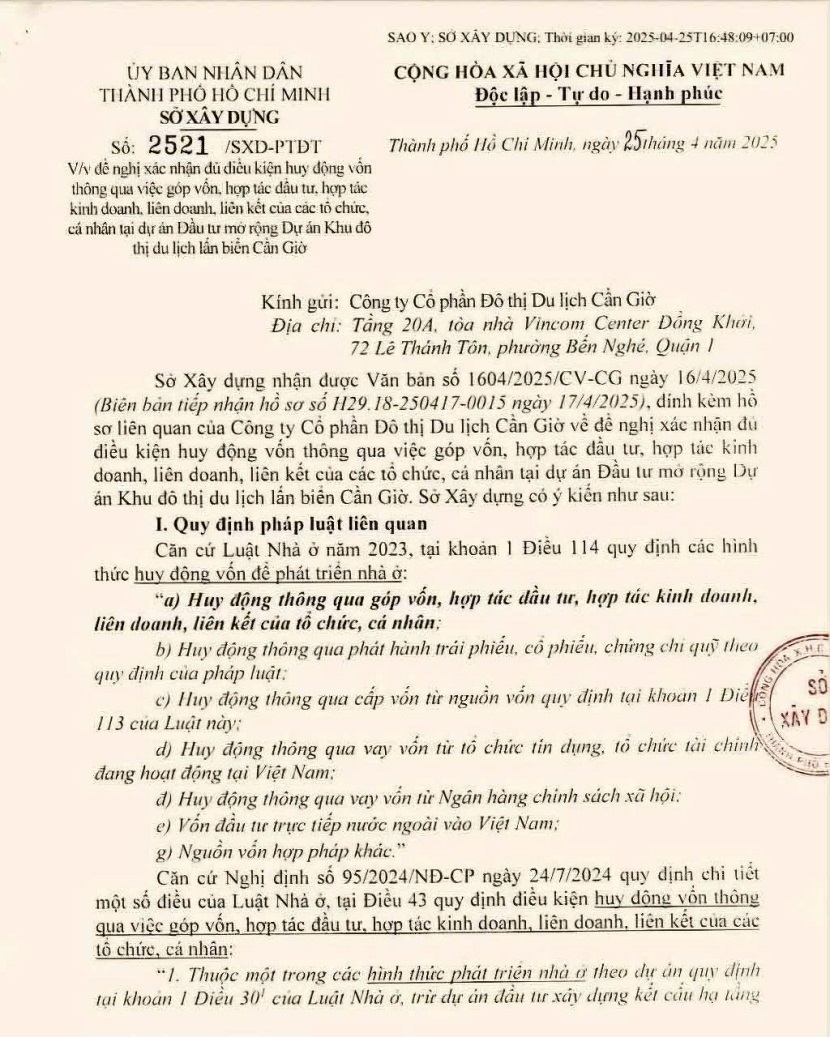 Theo đó, tại văn bản số 1604/2025/CV-CG được Công ty Cổ phần Đô thị Du lịch Cần Giờ gửi ngày 16/4/2025, đề nghị Sở Xây dựng TP. Hồ Chí Minh xác nhận đủ điều kiện huy động vốn thông qua việc góp vốn, hợp tác đầu tư, hợp tác kinh doanh, liên doanh, liên kết của các tổ chức, cá nhân tại dự án Khu đô thị du lịch lấn biển Cần Giờ.