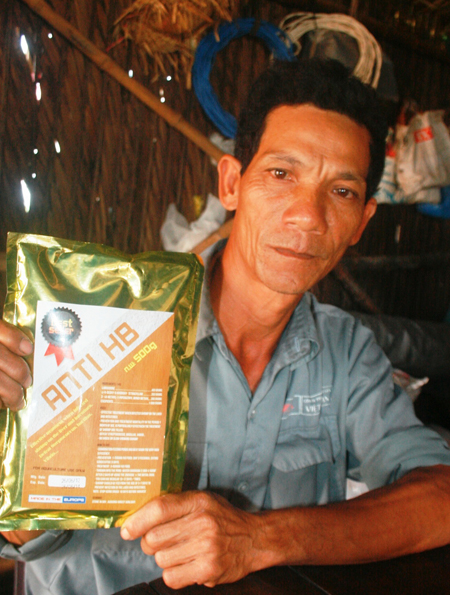 Hiện tại, tôm bị bệnh gan tụy, các nhà khoa học vẫn chưa tìm được nguyên nhân gây bệnh và thuốc đặc trị. Tuy nhiên, những vùng tôm bị bệnh đã xuất hiện loại thuốc đặc trị gan tụy cho tôm nhưng không rõ nguồn gốc. Gia đình ông Quắn vừa mua 2 bọc thuốc ANTI HB đặc trị gan cho tôm ghi trên bao bì một mặt bằng tiếng Anh, mặt còn lại ghi tiếng Việt có hướng dẫn sử dụng và nhà nhập khẩu là OCEAN AQUATECH SOLUTION LTD; CO. Sau khi đọc kỹ, cả ông Quắn cũng bất ngờ vì thông thường thuốc nhập khẩu có đơn vị nhập khẩu và địa chỉ, số điện thoại để có vấn đề gì liên hệ, còn đằng này không thấy thông tin gì cả.