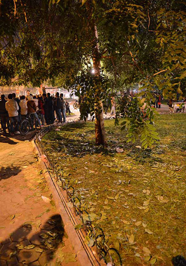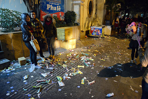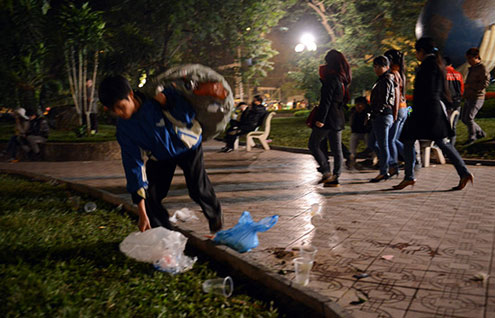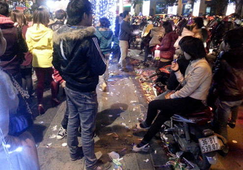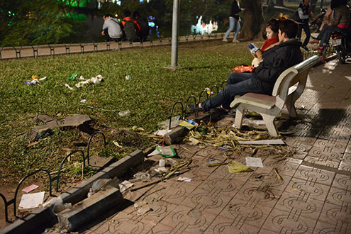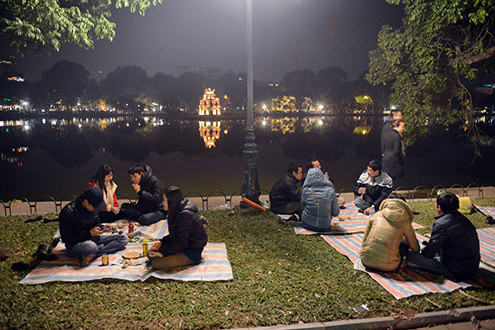 | Tối 24/12, hàng nghìn người đổ về khu trung tâm thủ đô khiến đường phố ùn tắc kéo dài. Các thảm cỏ quanh hồ Gươm biến thành các quán nhậu, quán trà chanh, mực nướng...
