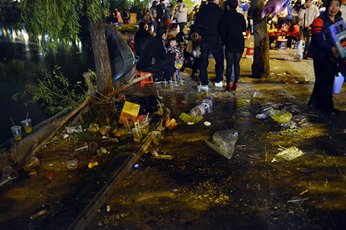 | Quán kem Thủy tạ ven hồ quá tải, lại thiếu thùng rác và thiếu cả ý thức của người ăn....