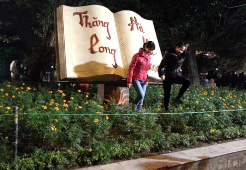 | Không chỉ xả rác bừa bãi, nhiều bạn trẻ còn trèo cả vào vườn hoa ven hồ để chụp ảnh. |