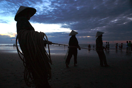 | Lưới dài cả cây số, hàng chục người kéo từ lúc mặt trời chưa mọc cho tới lúc những tia nắng rọi chiếu rực rỡ trên mặt biển. |