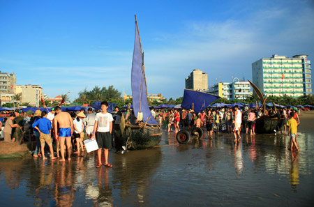 | Buổi kéo lưới kết thúc cũng là lúc bắt đầu phiên chợ cá ngay trên bờ biển. |
