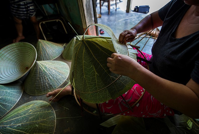 Từ những chiếc lá sen bình thường, người thợ cần phải trải qua các công đoạn như ủ lá sen bằng nước javel, sau đó đem phơi khô và ủi lá – khi đó mới có thể đưa lá đi chằm làm nón.