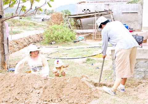 | Người dân góp sức thi công lắp đặt, đem nước về từng hộ gia đình. |