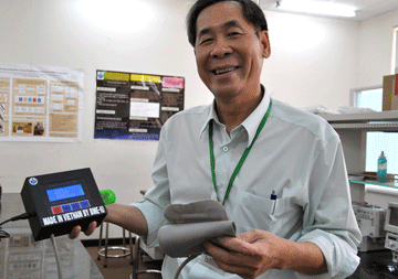 TS Tới đang giới thiệu máy đo huyết áp tự động. Ảnh: Thái Ngọc