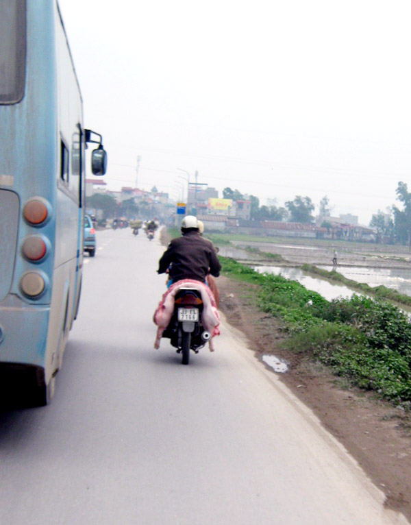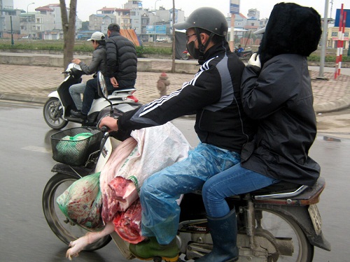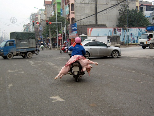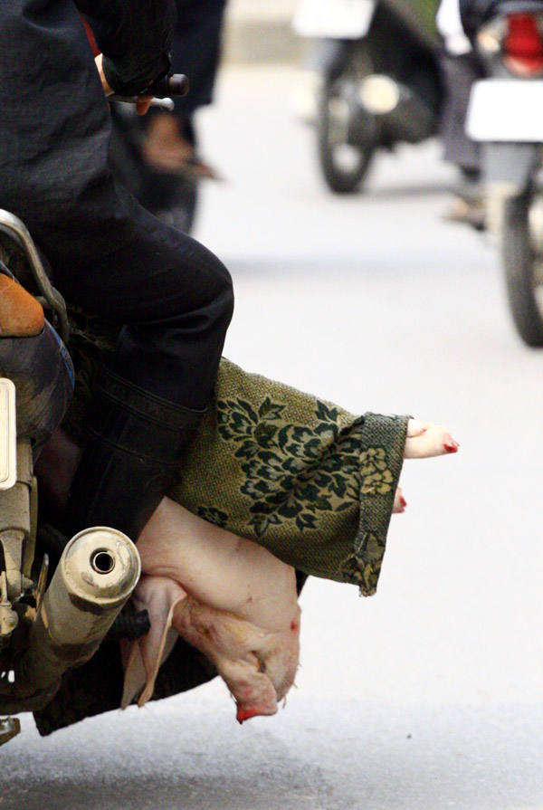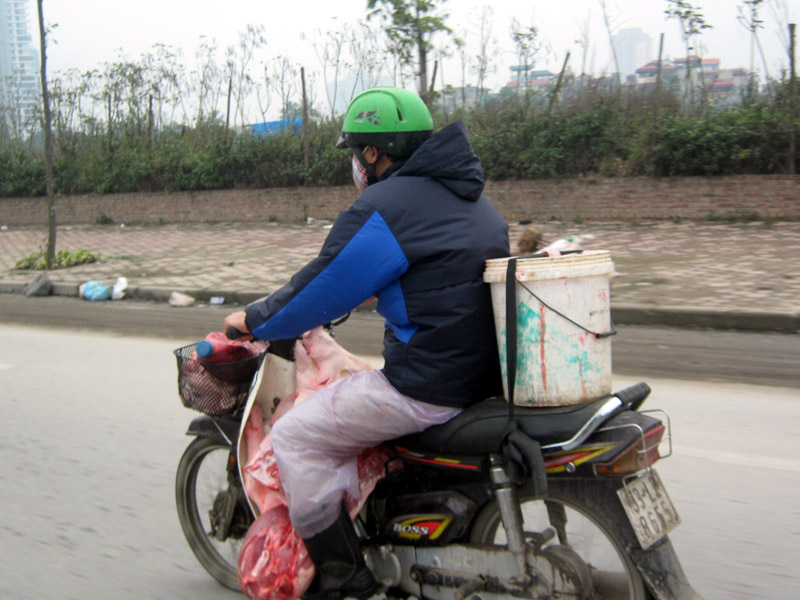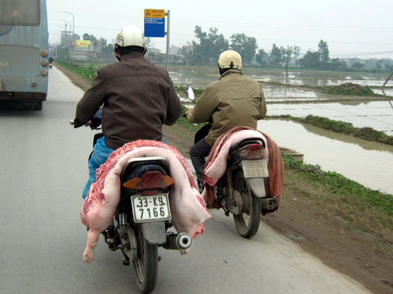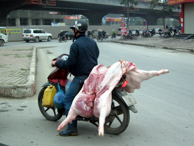 | Thay vì được che chắn cẩn thận, những chú lợn được đưa từ lò mổ ở ngoại thành Hà Nội vào trung tâm thoải mái phơi trên phố như thế này. Ảnh của Steve Brown - khách du lịch người Anh.