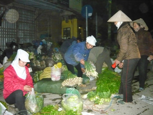 Hơn một giờ sáng, gạt đi cái rét căm căm do ảnh hưởng của đợt không khí lạnh tăng cường kéo nhiệt độ xuống thấp, cơn mưa phùn bất chợt khiến tay chân run lên bần bận, chúng tôi bắt đầu nhập vai người mua đi dự phiên chợ “âm phủ”. Dưới ánh đèn đứt đoạn mờ mờ huyền ảo rọi xuống những vũng nước mưa lấp lánh. Từng đoàn xe và phương tiện vẫn tất bật ùn ùn kéo đến, tạo nên một khung cảnh hết sức sôi động giữa lúc phố phường đang ngủ yên.