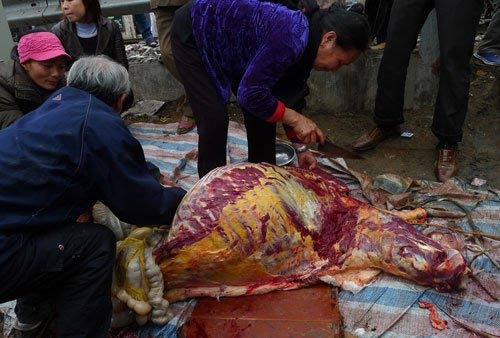 Nhiều người đi đường dừng lại xem cảnh giết mổ
