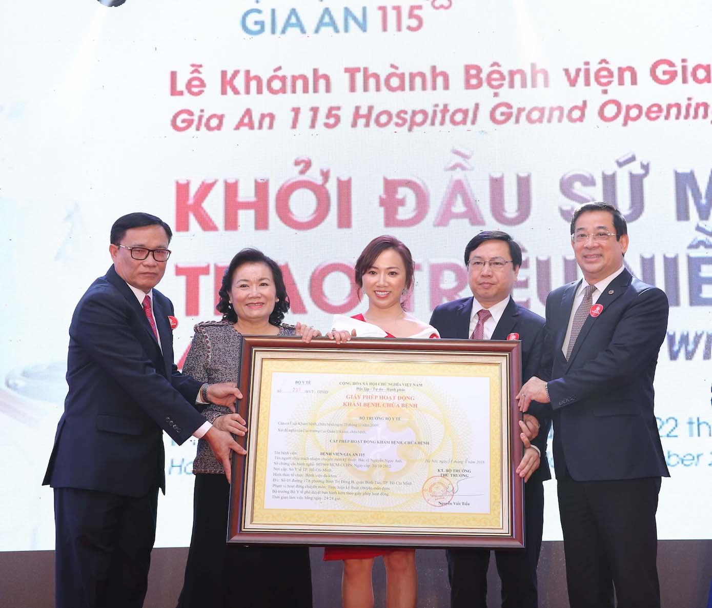 PGS.TS Lương Ngọc Khuê, Cục trưởng Cục quản lý khám chữa bệnh (người ngoài cùng bên phải) trao Giấy phép hoạt động khám chữa bệnh của Bộ Y tế cho BV Gia An 115.