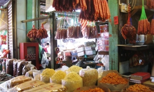 | Lạp xưởng không nhãn mác được bày bán công khai tại các chợ. |